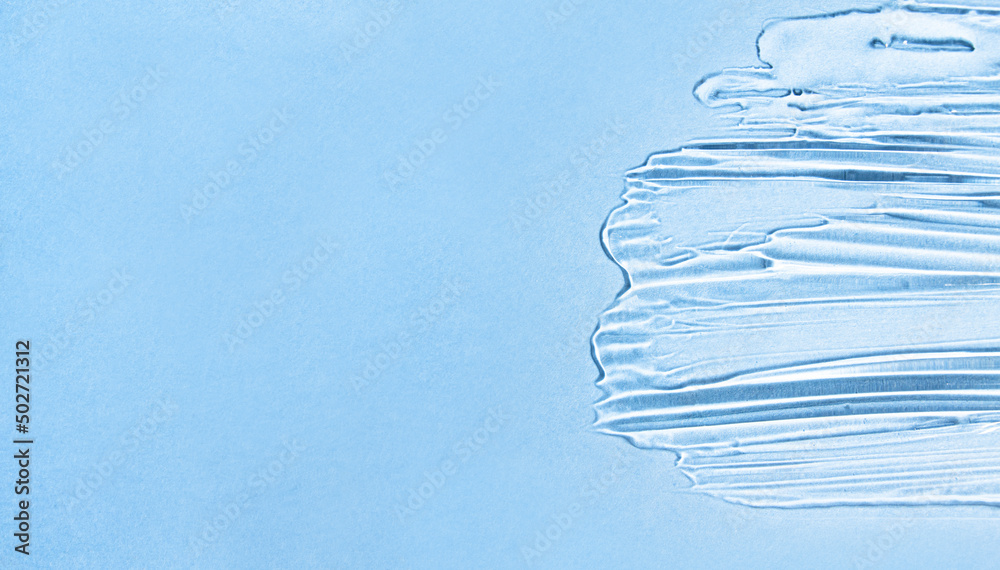 Texture of liquid cosmetic hyaluronic gel for moisturizing and maintaining skin elasticity on a blue background, copy space.