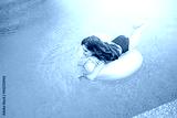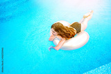 Young woman swimming on inflatable ring at the swimming pool.