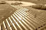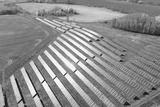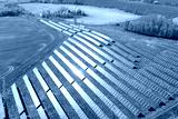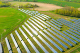 Panele słoneczne na zboczu wzgórza porośniętego zieloną, oświetlone blaskiem słońca. Widok z drona.