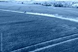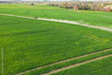 Równina pokryta łąkami i polami sfotografowana z drona. Droga polna przebiegająca przez pola i łąki widziana z wysokości. Zdjęcie z drona. W oddali widać zabudowania pobliskiej wioski.