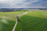 Droga polna przebiegająca przez pola i łąki widziana z wysokości. Zdjęcie z drona. W oddali widać zabudowania pobliskiej wioski.