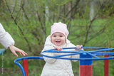 Smiling baby toddler rides carousel in playground outside. Concept of kindergarten and childhood.