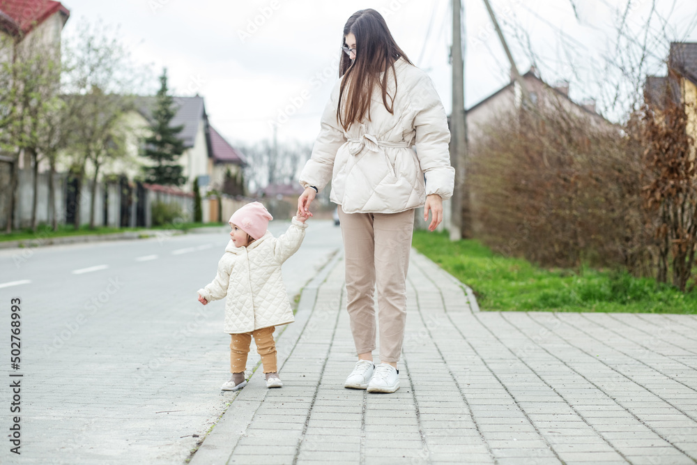 Little baby girl learns to walk with mom's help outside. Young mother and daughter toddler