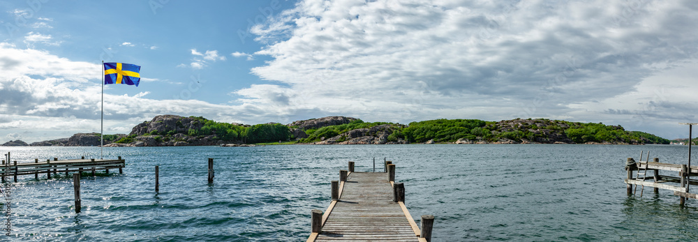 Steg an einem See in Schweden mit Schwedischer Flagge