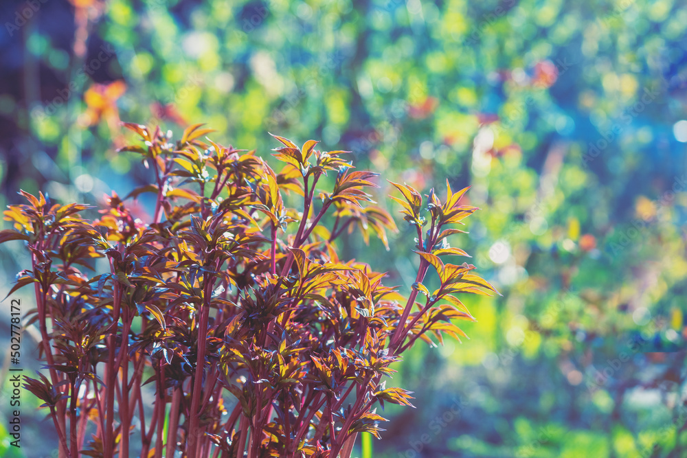 Young shoots of peonies flowers against colorful blurred background