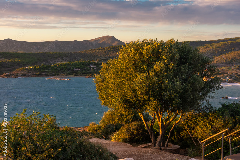 The Temple of Poseidon at Cape Sounion at sunset, over the Aegean Sea, Greece