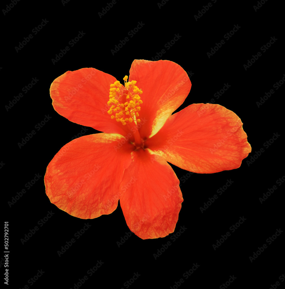 Closeup of orange hibiscus flower blossom blooming isolated on black background, stock photo, spring summer flower