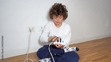 7-year-old child at home uses and plays with the electrical socket with the danger of getting shocked - domestic life in childhood