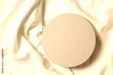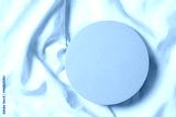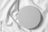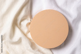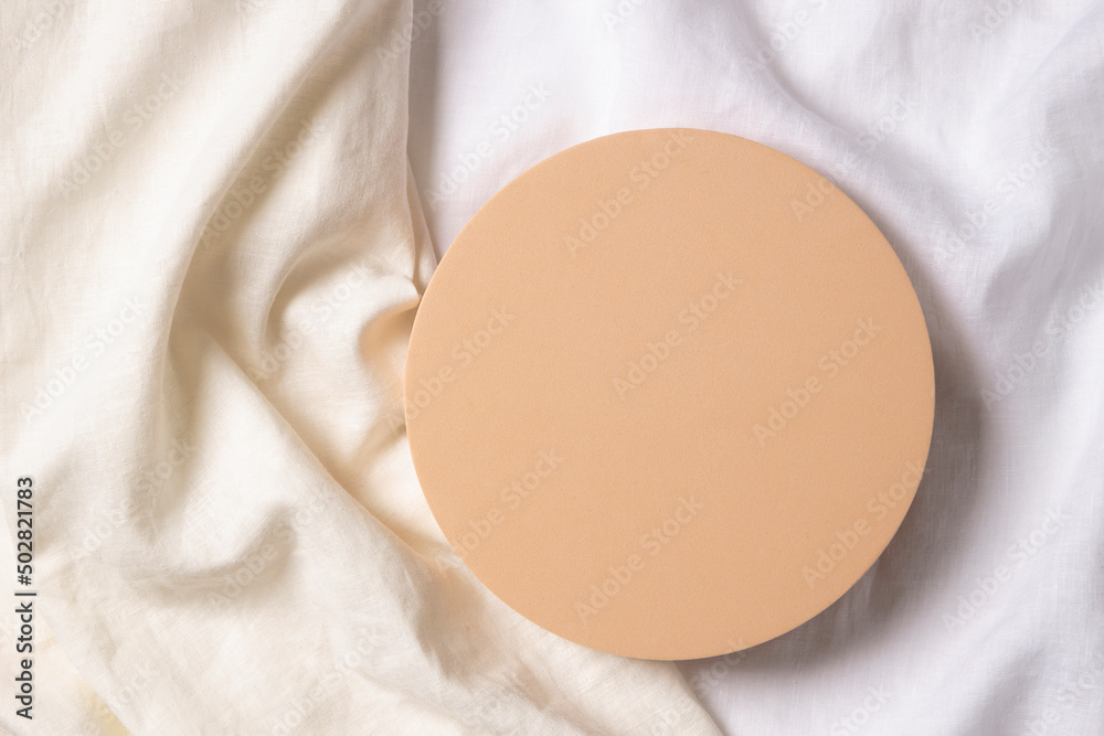 Blank pastel round platform podium for cosmetics or products on natural white linen fabric background. Top view, copy space