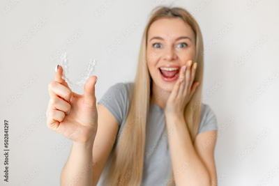 Young beautiful girl holding dental aligner over isolated white background screaming proud and celebrating crazy and amazed for success with open eyes