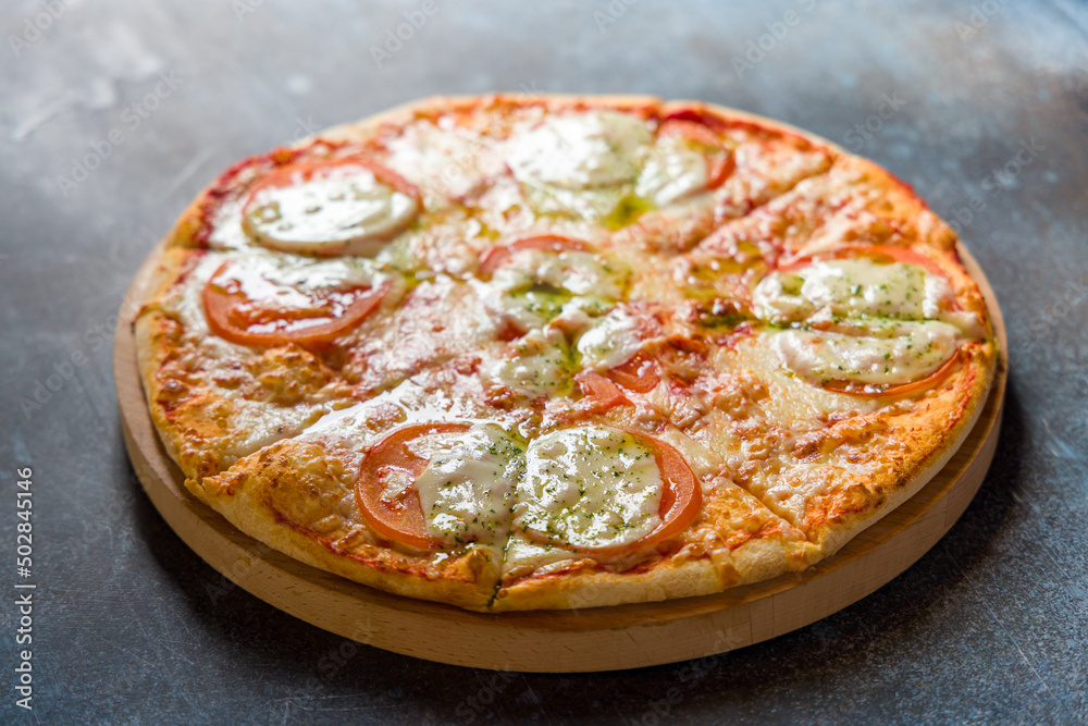 Italian pizza Margherita buffalo with tomatoes, mozzarella and cheese with tomato sauce on wooden board on dark blue stone table