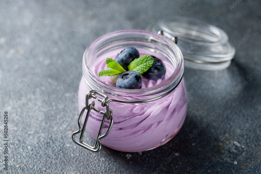 blueberry mousse on bowl with fresh mint and fresh berries macro close up