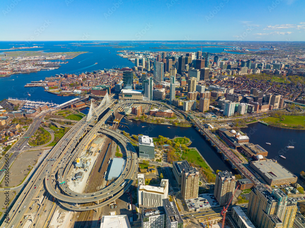Boston downtown financial district skyline and Leonard Zakim Bridge aerial view, with Boston Harbor and Charles River at the background, Boston, Massachusetts MA, USA.