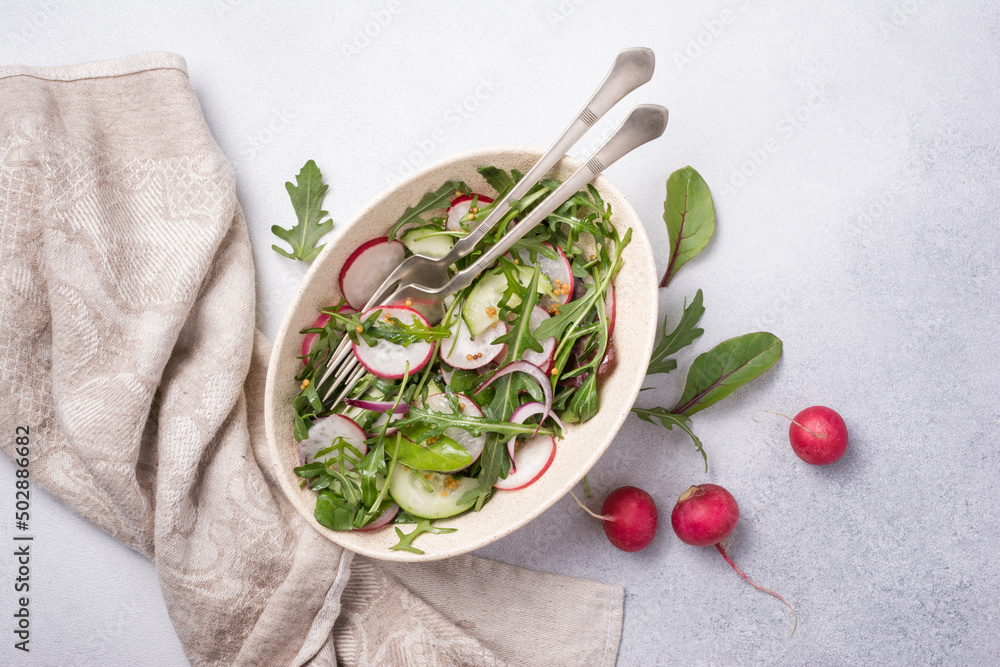 Healthy vegetarian salad with fresh radish, cucumber, onion and mix of green leaves
