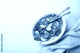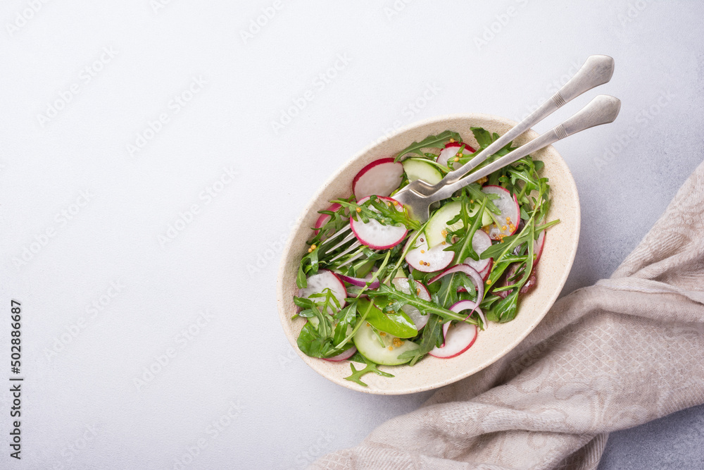 Healthy vegetarian salad with fresh radish, cucumber, onion and mix of green leaves