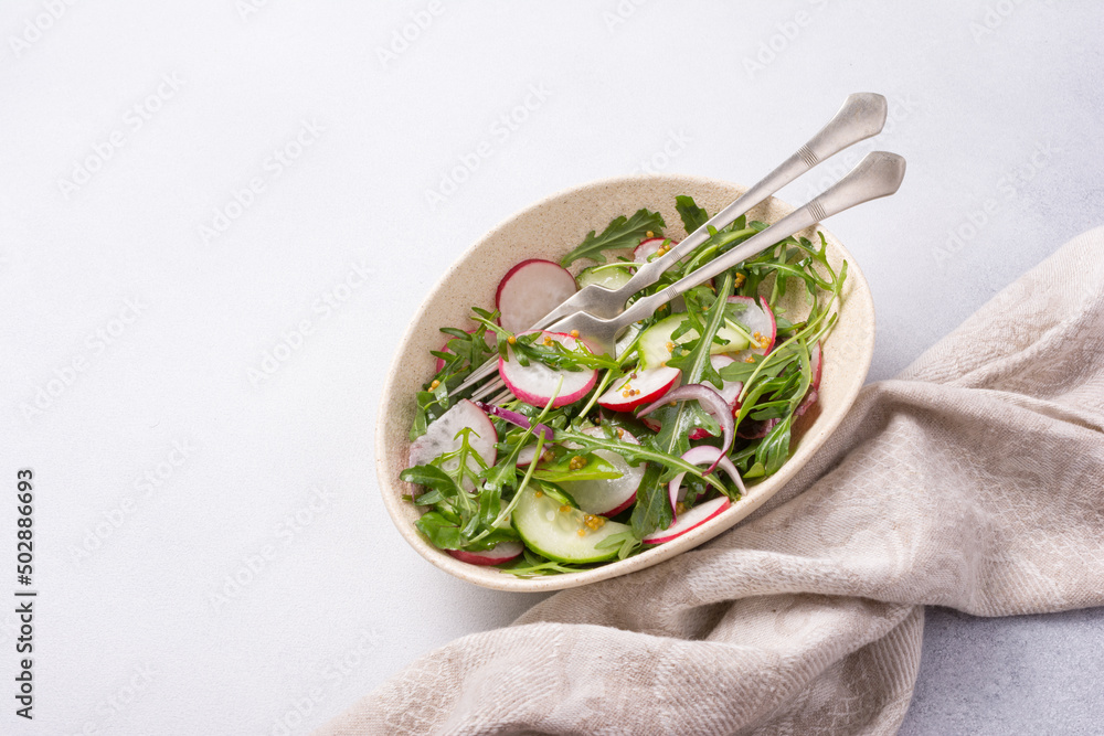 Healthy vegetarian salad with fresh radish, cucumber, onion and mix of green leaves