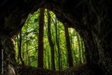Deciduous trees with green leaves and small cave