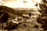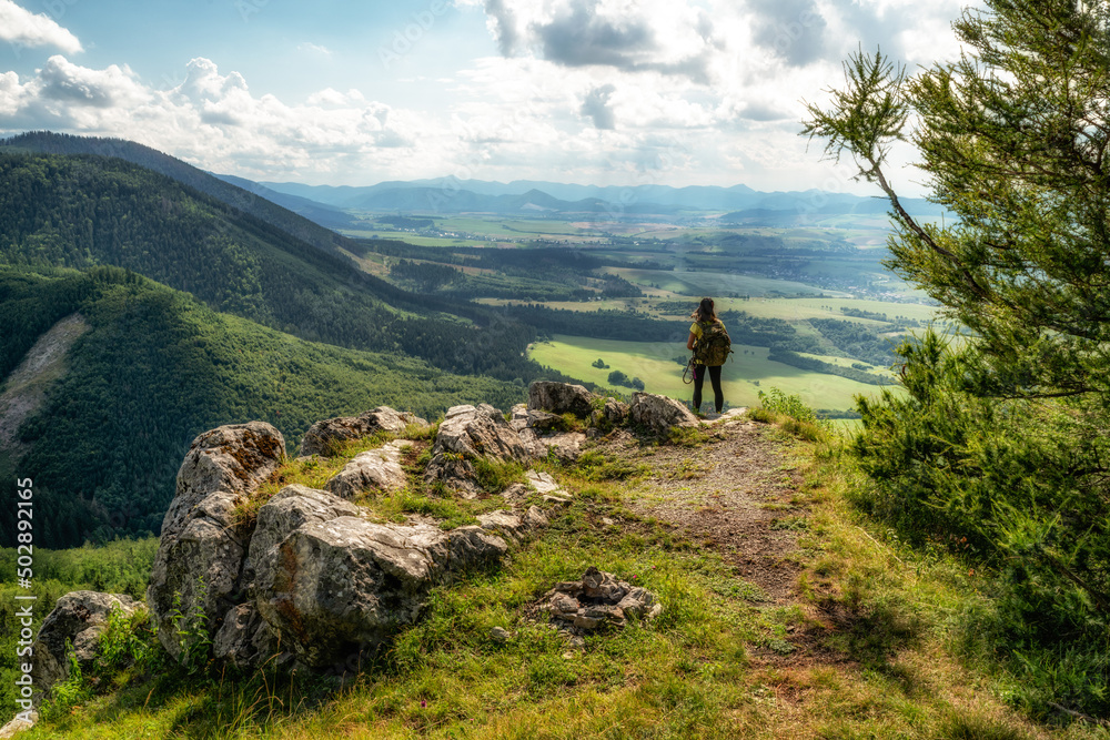 Hiking girl with backpack looking on beautiful summer mountain landscape from hill Cipcie in Slovakia