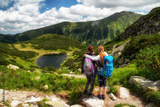 Girl tourist looking on mountain lake and summer hills landscape in Western Tatras at Slovakia