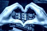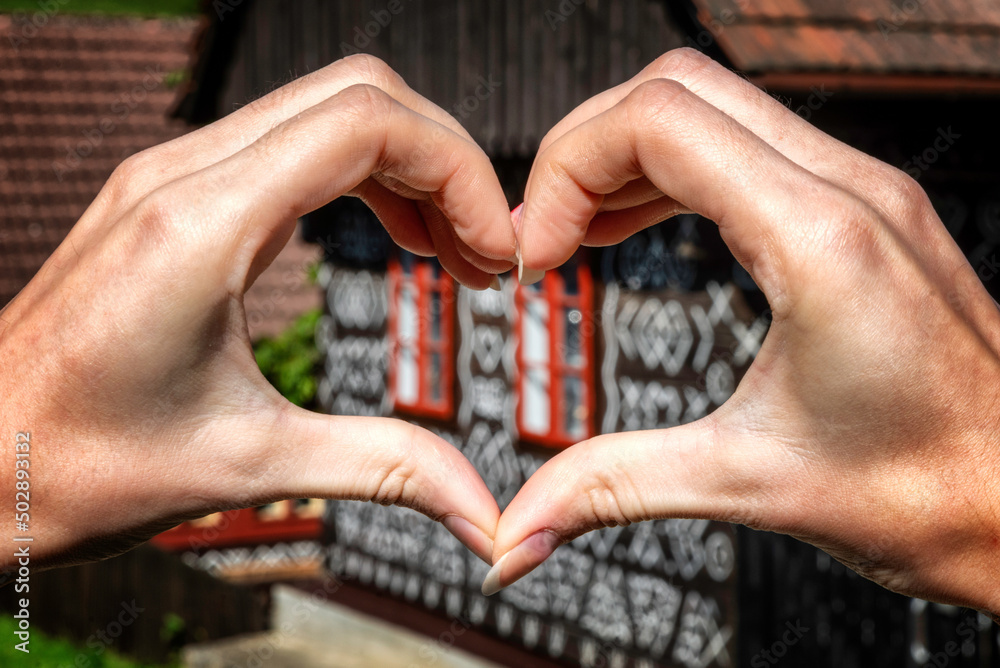 Heart shape from hands and old wooden cottage in village Cicmany in Slovakia