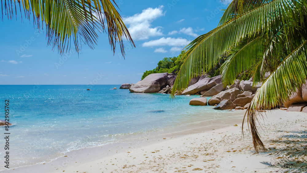 Praslin Seychelles tropical island with withe beaches and palm trees, Anse Lazio beach,Palm tree stands over deserted tropical island dream beach in Anse Lazio, Seychelles.