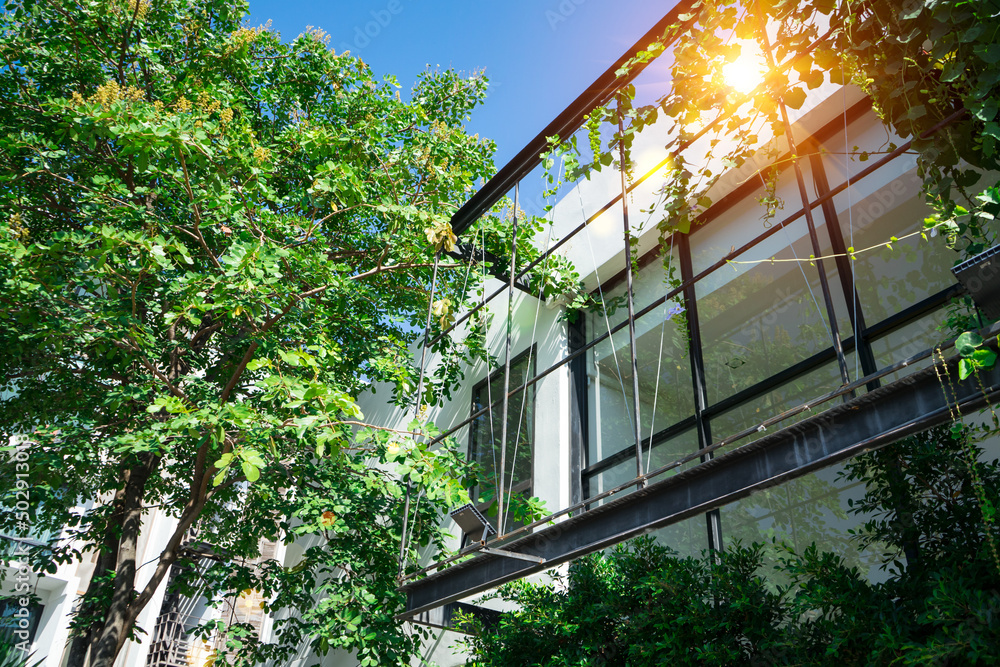 Glass building with tree and ivy that climbs their storied walls cover the glass building with sunlight. Vines not only lend greenery through the summer