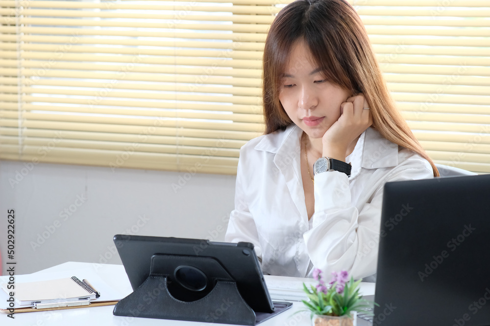 Businesswoman working in office on her laptop appears concerned, fatigued, and overburdened.