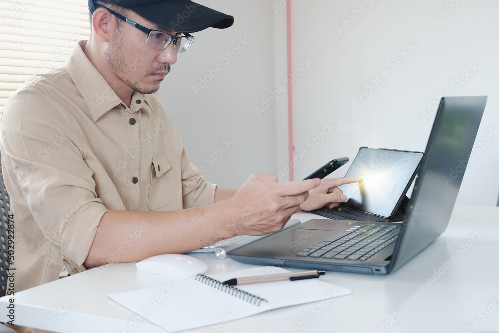 Businessman using smart phone and laptop at office. Businessman or student working on computer and texting smartphone. Freelance, education and technology concept