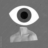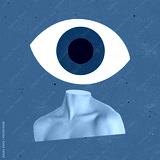 Contemporary art collage. Female bust with giant drawn eye isolated over bright red background