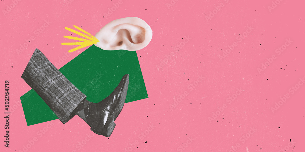 Contemporary art collage. Male leg kicking human ear isolated over pink background. Refusing fake information