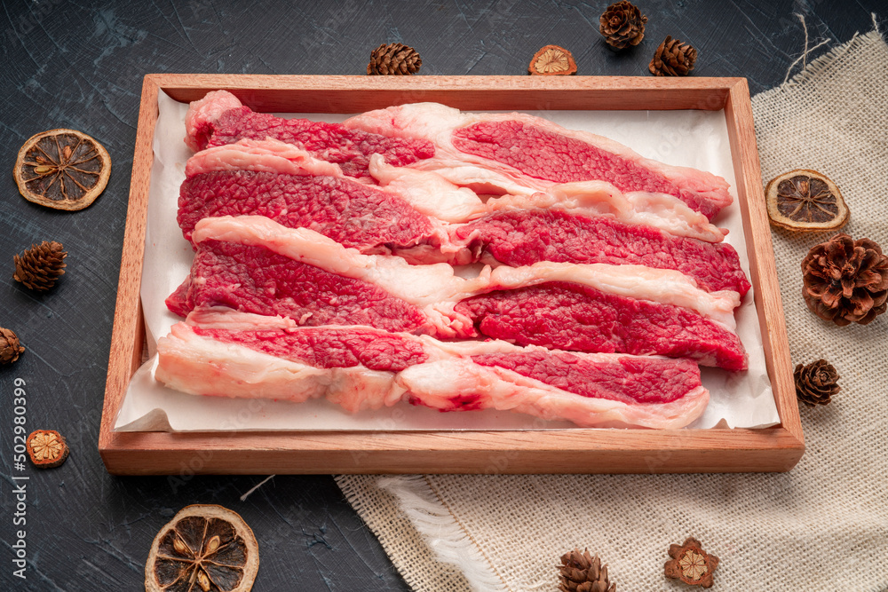Sliced brisket beef with rosemary on wooden plate, Sliced brisket beef on black wooden background.