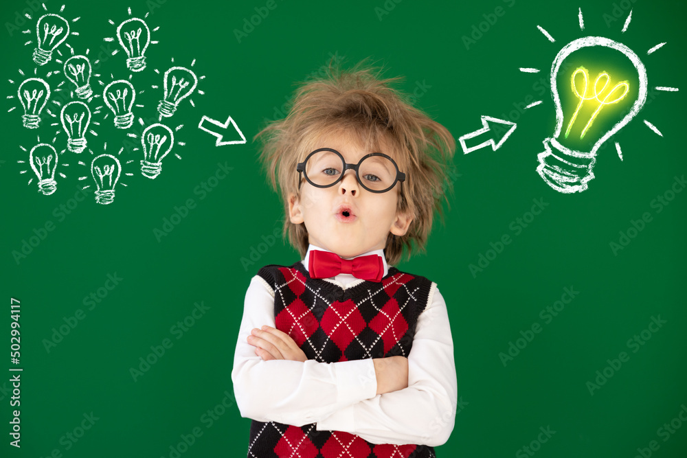 Happy child in class against green chalkboard