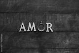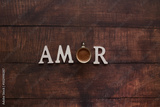 Palabra amor con la o de taza de café en mesa de madera
