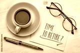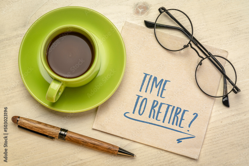 Time to retire? Handwriting on a napkin with a cup of coffee. Finance and retirement planning concept.