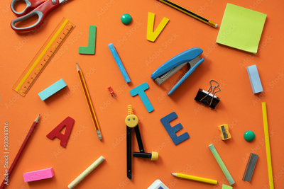 Different stationery on orange table background, flat lay. Space for text, back to school concept