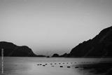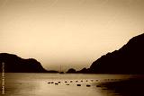 Beautiful sunrise with yacht sailing the sea with rocks islands on the background.