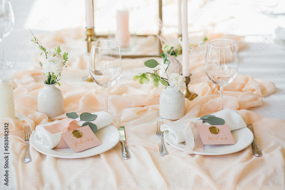 banquet tables with white tablecloths are in the hall of the old house, on the tables are flower arrangements, candles, plates with napkins, glasses and cutlery