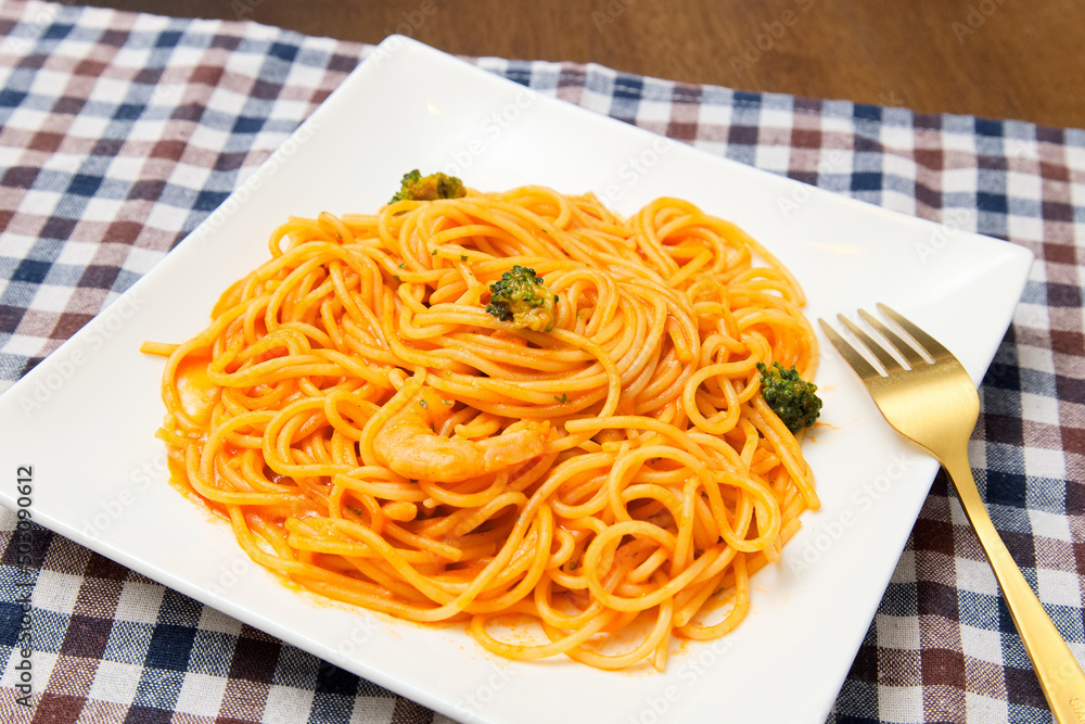 トマトクリームパスタと金のフォーク