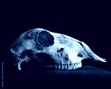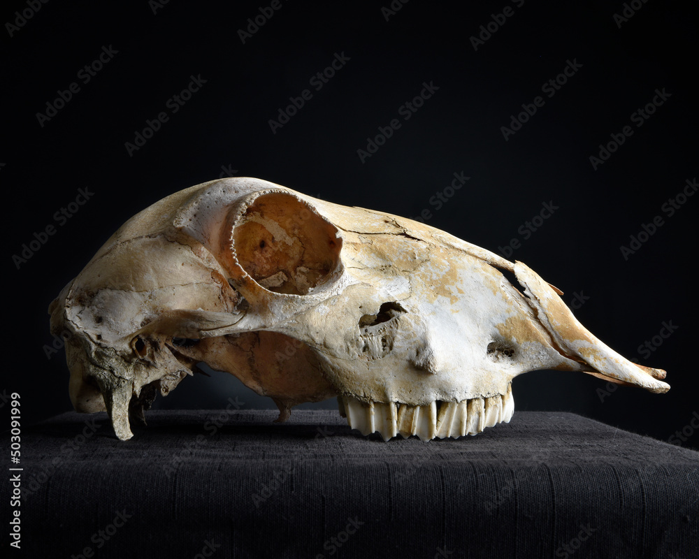 close up portrait of a old dried sheep skull bones, isolated on dark studio background.