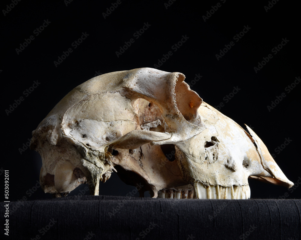 close up portrait of a old dried sheep skull bones, isolated on dark studio background.