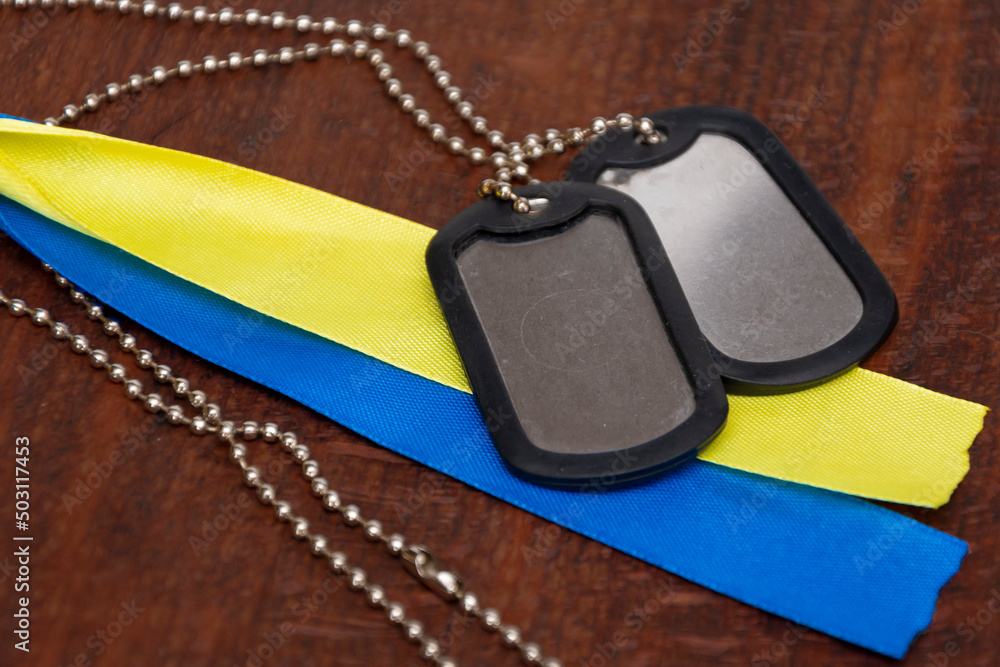 Army identification badges and yellow-blue ribbons of the Ukrainian flag on a textured background. Concept: service in the Ukrainian army, mobilization in Ukraine, the war for freedom.