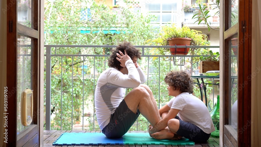 father and 7-year-old son boy do gym gymnastics at home in the balcony with the arrival of spring they get ready for summer, , push-ups and abdominals - sport activities outside of the window