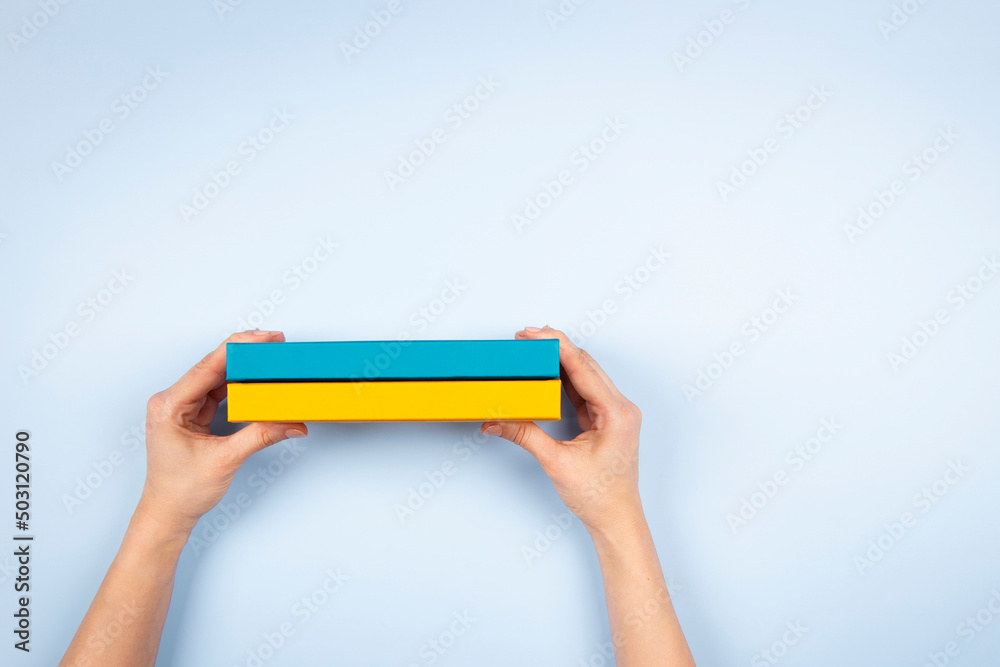Woman hands holding two blue and yellow color books over light blue background. Education, self-learning, book swap