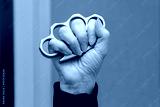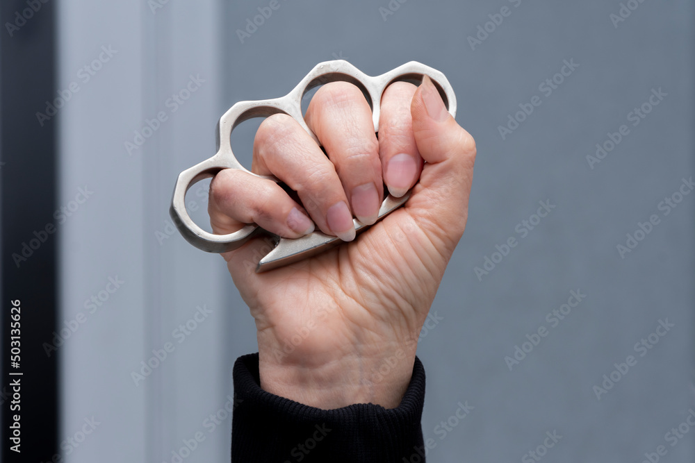 Blow with brass knuckles. The hand of an elderly woman clutches a metal brass knuckles. Concept, women's self-defense, traumatic objects, family quarrel, domestic scandal, domestic crime and violence.