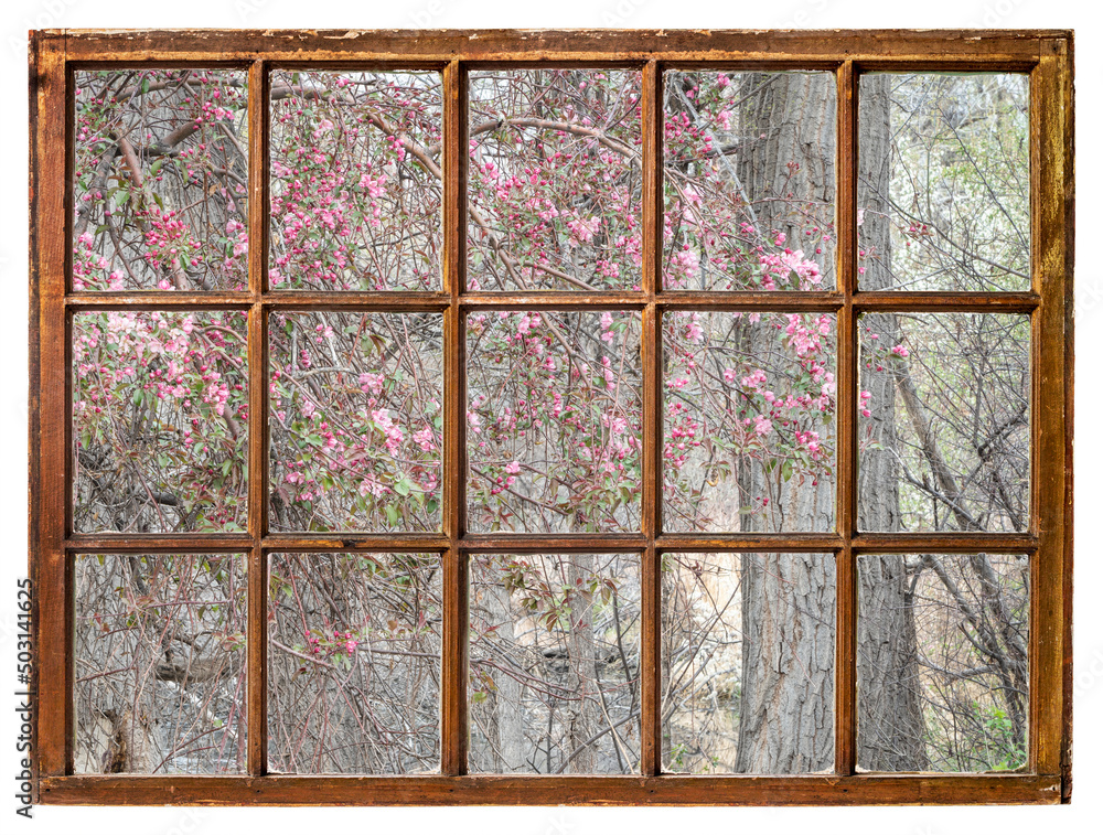 springtime tapestry of dry branches, green fresh leaves and crab apple tree blooming as seen from a vintage sash window