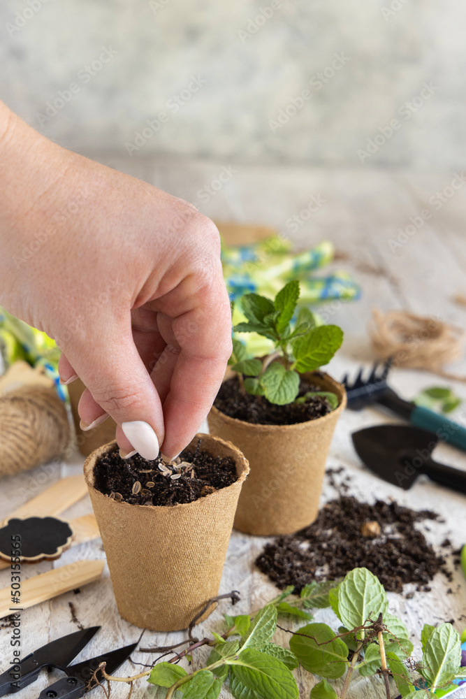 Hand planting seeds in biodegradable pots near garden tools. Indoor gardening, germinating herb seeds