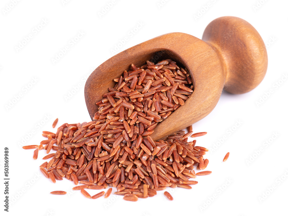 Red rice isolated in wooden scoop, on white background. Whole grain raw brown rice.