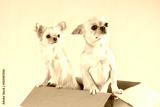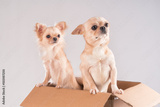 Two small white chihuahua dogs peeking out of a cardboard box