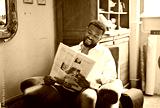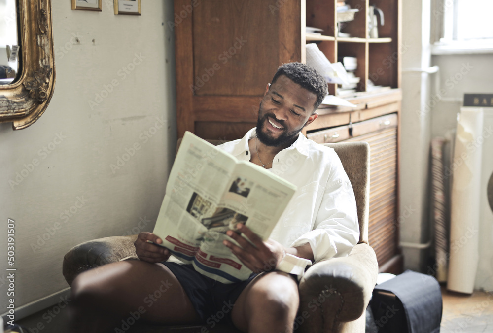 portrait of young man smiling while reading a newspaper sitting in an armchair