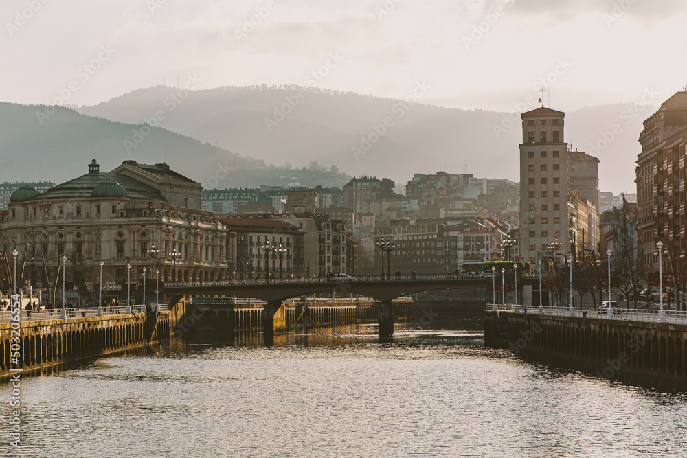 The cityscape of Bilbao, Spain. The Nervion river crosses Bilbao old town.